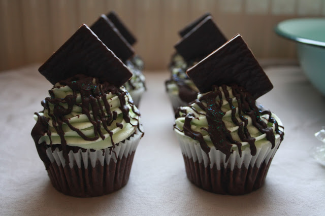 Once each cupcakes is frosted, melt the chocolate in the microwave for around 1 1/2-2mins, and drizzle over the top of each cupcake. Then sprinkle over a little edible glitter and finish each cupcake with a mint thin.